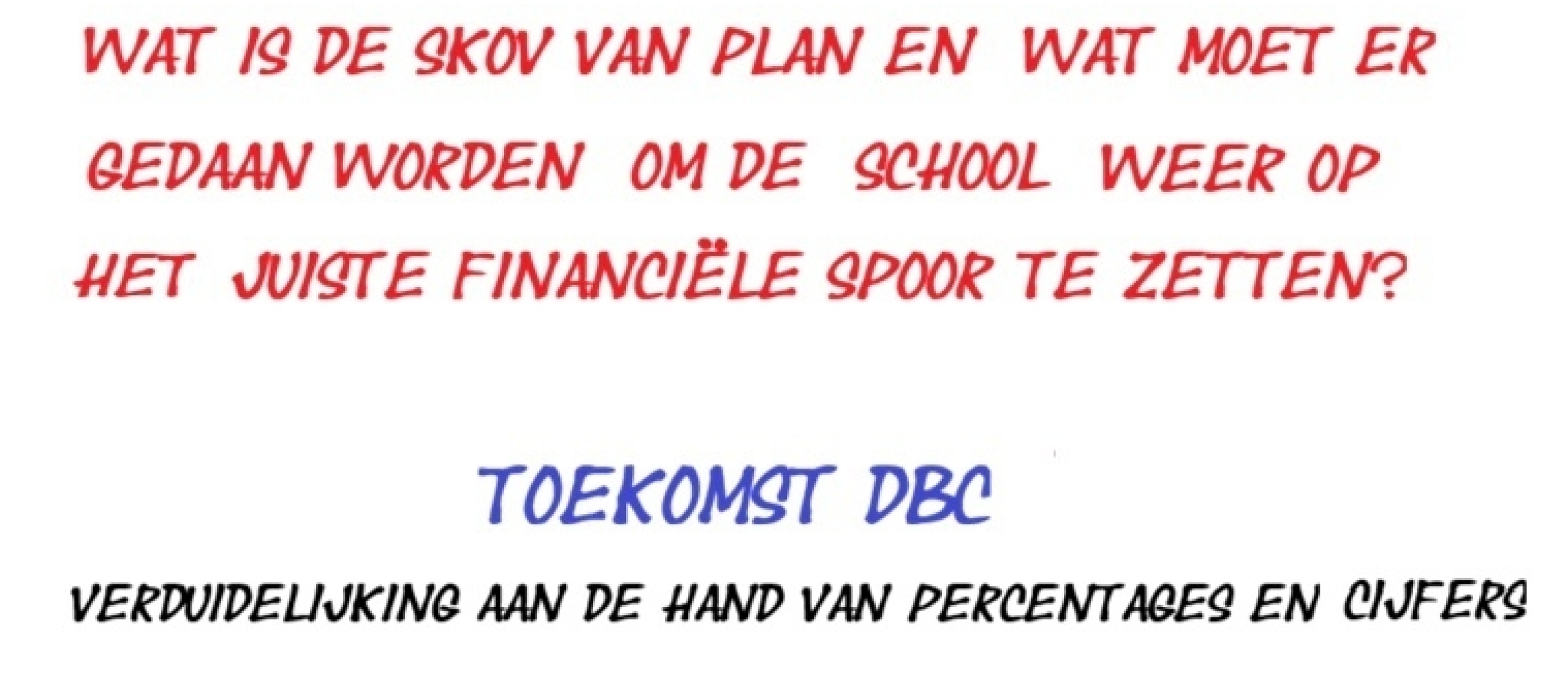 Als we in de jaarverslagen van de SKOV lezen dat een sluitende begroting niet haalbaar wordt geacht voor een VO-school met op het moment 1040 leerlingen, dan roept dat de vraag op waarom dat destijds wel kon toen DBC in de opbouwfase veel minder dan 1000 leerlingen telde. En hoe het toenmalige bestuur het voor elkaar kreeg om de leerlingen niet alleen onderwijs van hoge kwaliteit te bieden, maar ook om zoveel geld over te houden dat de SKOV een van de rijkste schoolbesturen van Nederland werd. De functionarissen die toen leiding gaven aan de SKOV en DBC hebben zich bereid verklaard het huidige bestuur bij te staan in de aanpak van de financiële problematiek op het DBC, zodat wij hopen dat het bestuur ook hun deskundigheid zal aanspreken. Want het zou zomaar kunnen dat ‘de nog niet bekende andere oplossing’ waar de bestuursvoorzitter volgens het interview in de Nivo op hoopt, dan veel sneller in beeld zal komen.